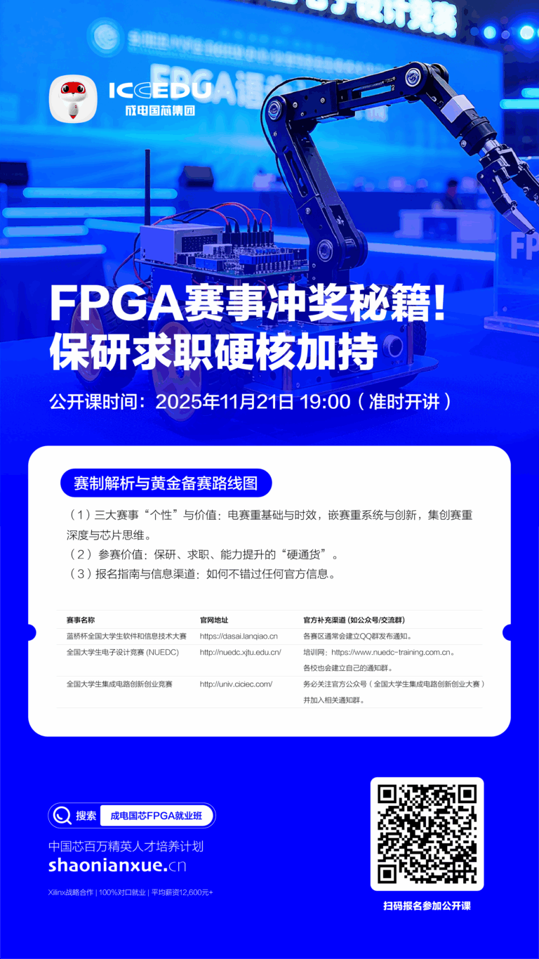 目前,成电国芯2025年秋季FPGA就业班(含天罡班、泰山班)正在火热招生中,限额20人小班教学,配备企业导师1对1带教,助力更多学员复制“闪电就业”神话!