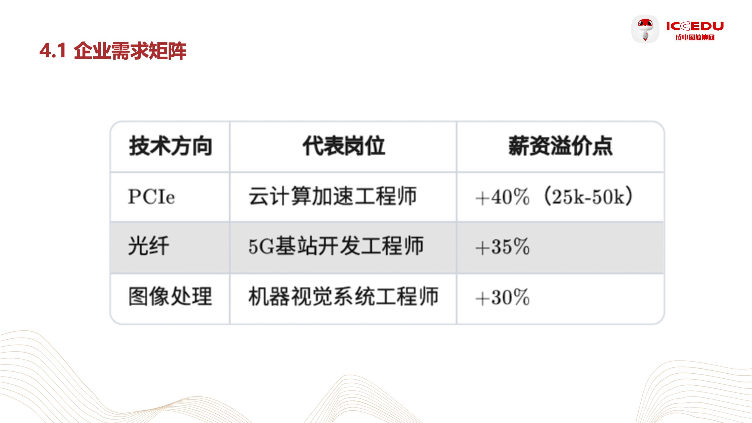 突破进阶技术壁垒的工程师,将具备解决行业「卡脖子」问题的潜力。成电国芯数据显示,掌握高速信号处理与并行计算的FPGA工程师,在通信设备、航空航天等领域的薪资溢价可达30%以上,且成为企业核心项目的「技术核心」储备人才。