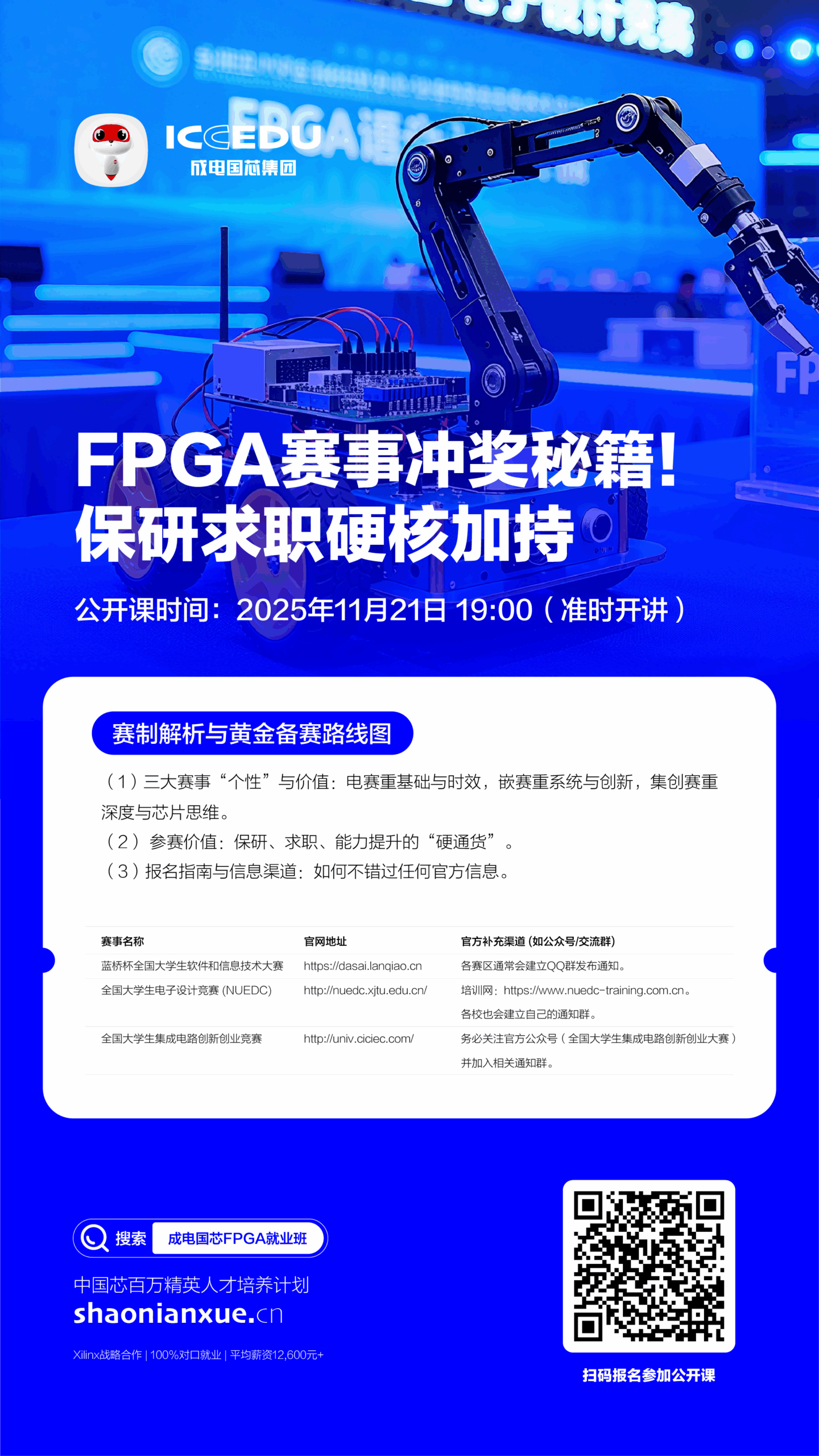多平台移植课:掌握FPGA(Xilinx/Altera)、MCU(STM32)、嵌入式Linux交叉开发,适配集创赛等高端赛事需求。