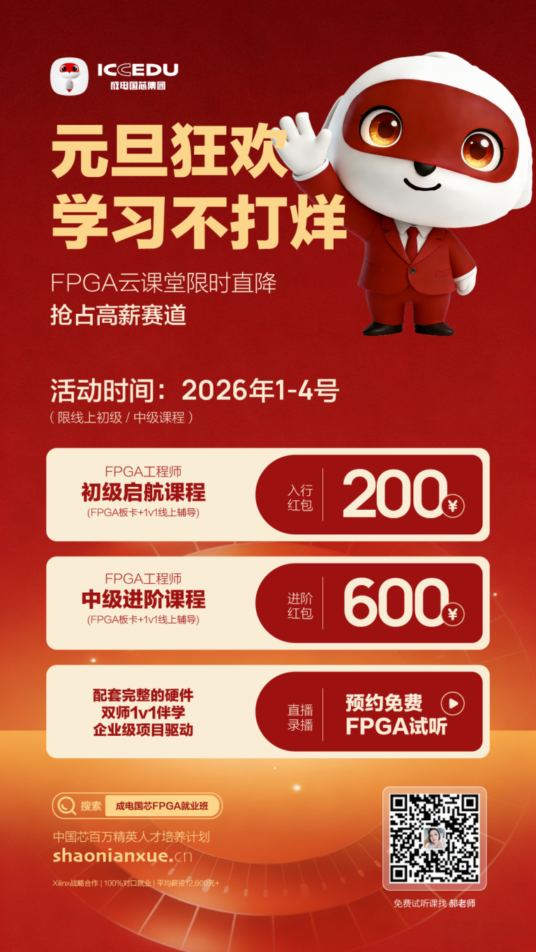 新手入门FPGA,最忌讳“盲目摸索、踩坑试错”。成电国芯为你准备了《FPGA新手避坑指南》+ 10个练手项目源码,私信发送【入门】即可免费领取!更有免费试听课程,带你体验“仿真+实战”的高效学习模式,解锁芯片赛道高薪密码。