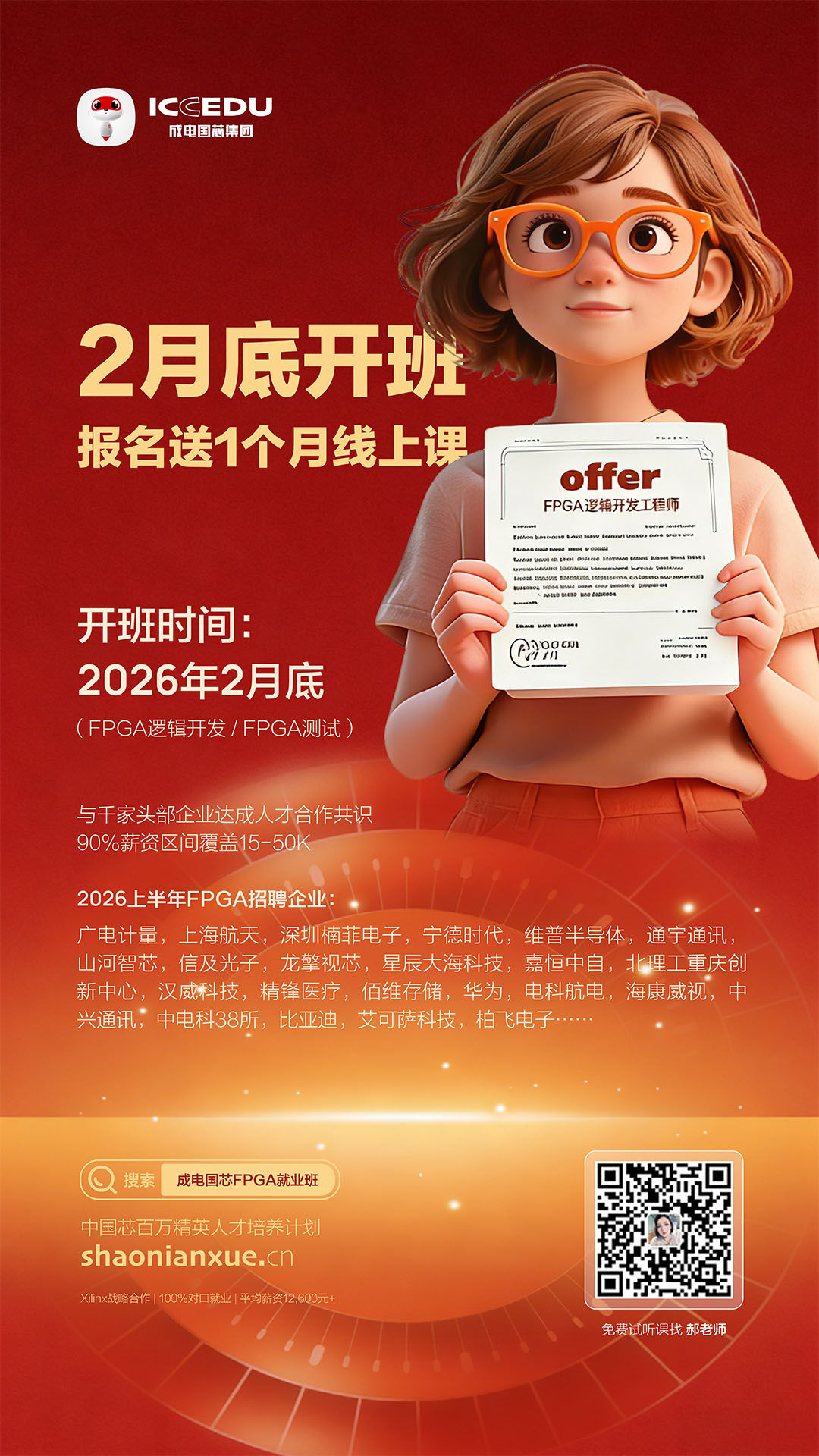 2月底开班名额有限,试听课与线上先导课福利限时锁定!立即联系郝老师:13258207810(微信同号),领取免费试听课、咨询课程详情,专属顾问一对一解答疑问。别再让犹豫错失高薪机会,跟着成电国芯解锁FPGA技能,叩开芯片行业高薪大门,抢占最后入学席位!